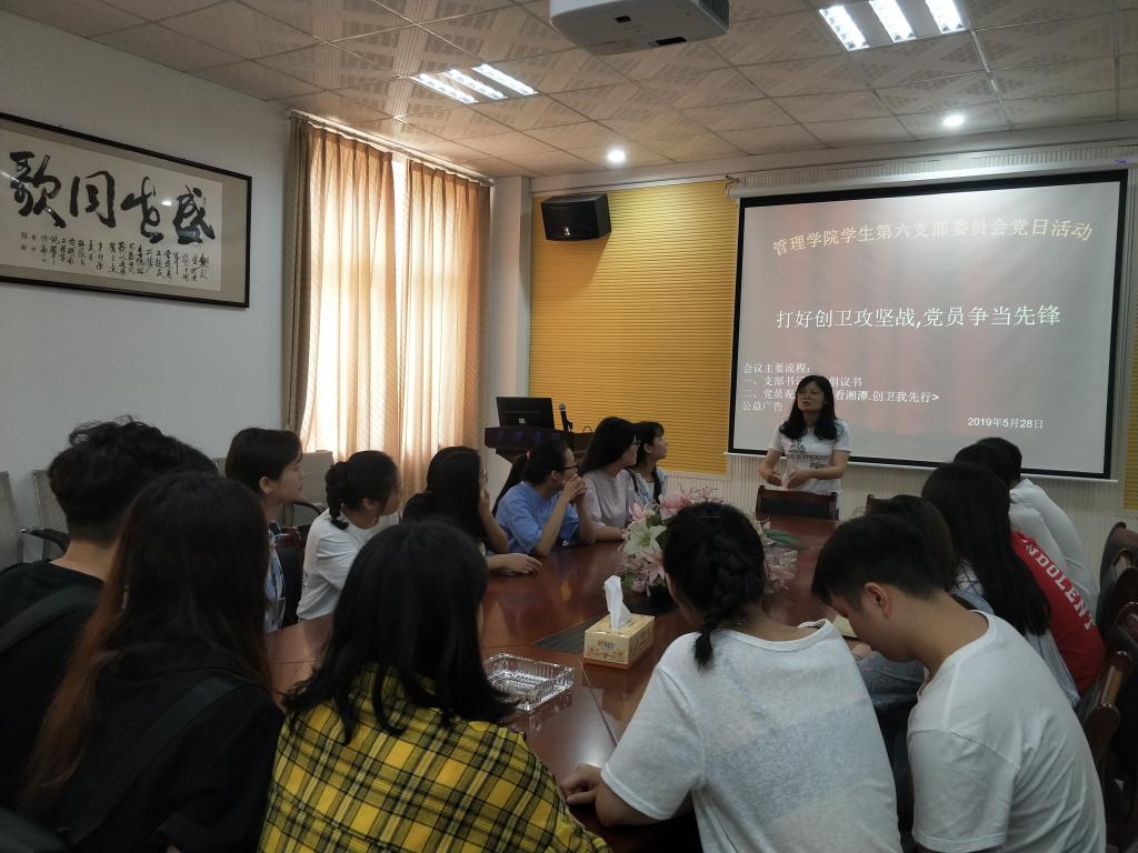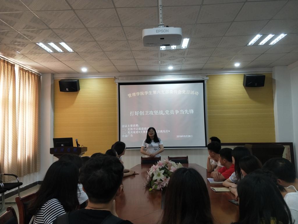 2019年5月28日下午,伟德国际victor1946管理学院学生第六支部党日活动在F104顺利召开,活动的主要是关于创建卫生城市,打好创卫攻坚战,发挥好党员模范带头作用,支部书记周艺老师主持本次活动,全体党员参加。