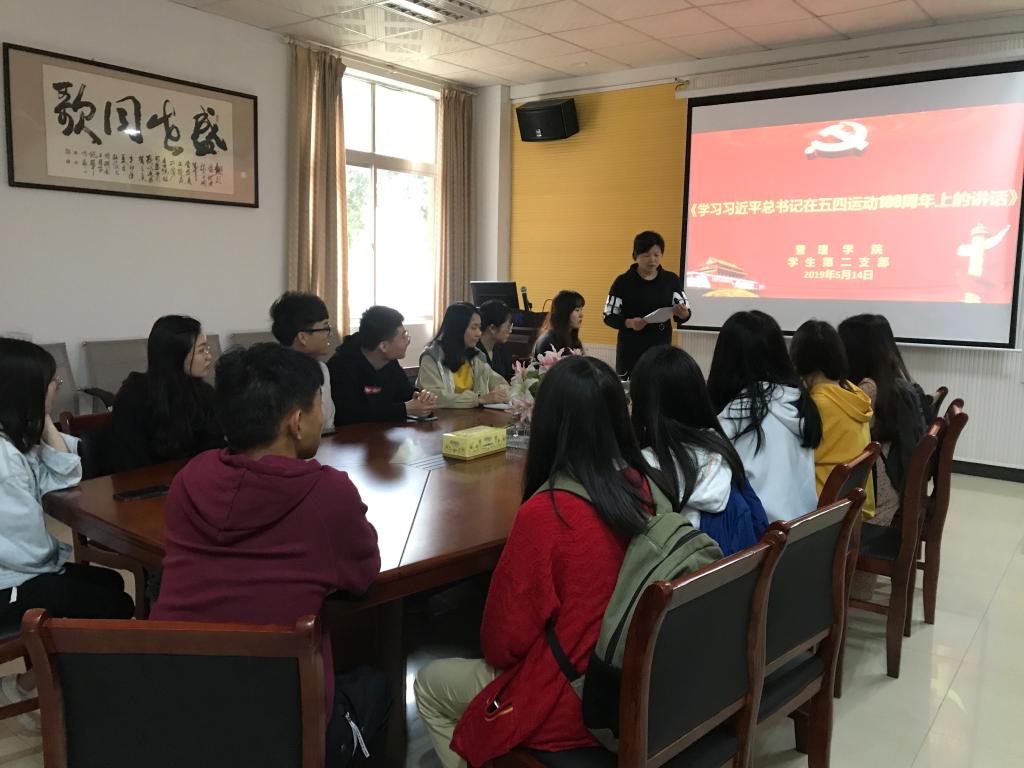 2019年5月14日12:40至13:20,管理学院第二支部全体党员在教学楼f104开展了“学习习近平总书记在五四运动100周年上的讲话”的党日活动。