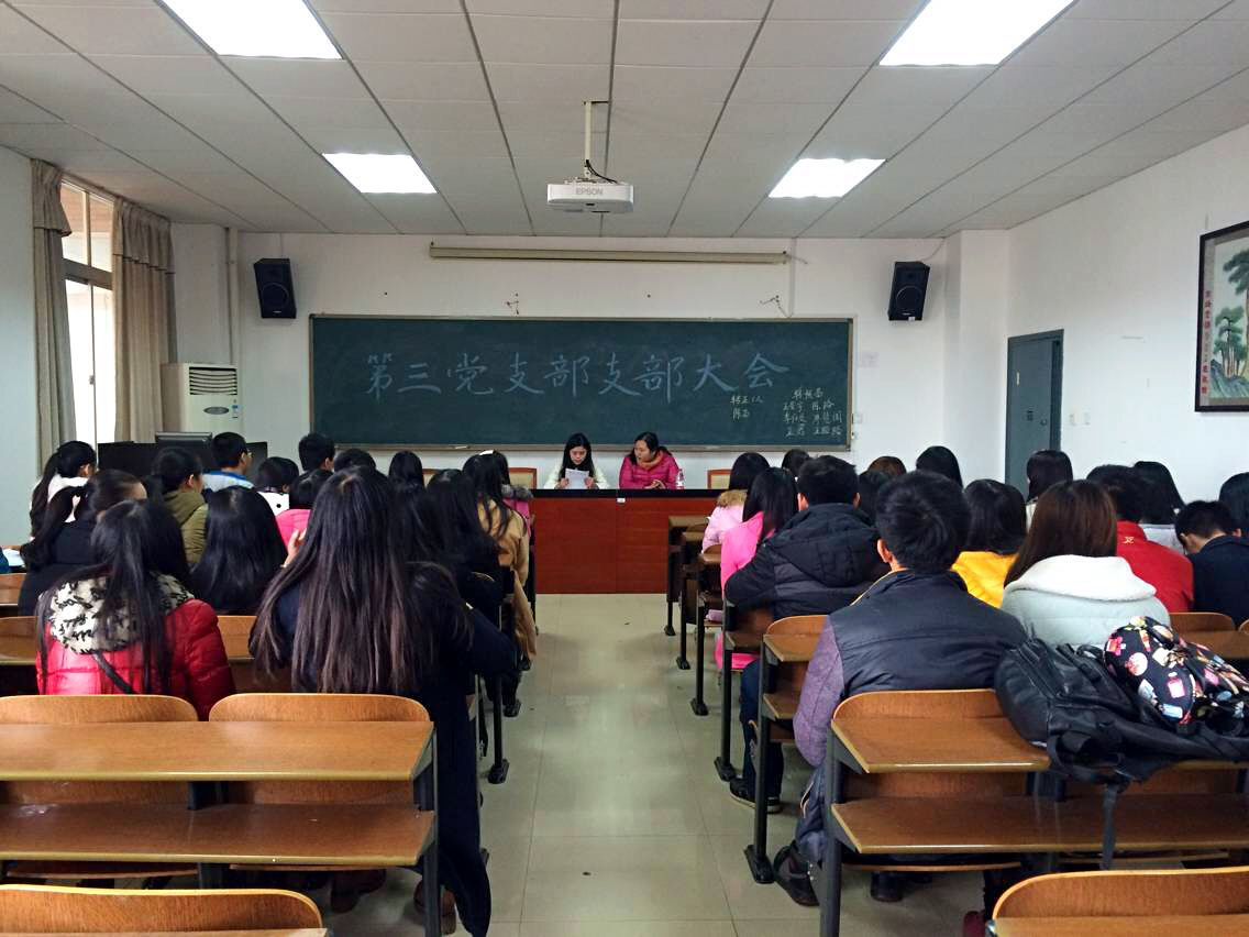 2015年12月8日中午12点30,管理学院学生第三党支部在G505召开了党支部大会,大会由管理学院学生第三党支部支委程烟兰主持,参加本次大会的有管理学院第三党支部书记:单艳艳,学生第三党支部支委:程烟兰,以及正式党员(6名)、预备党员(3名)、发展对象(6名)、培养对象积极分子若干名。