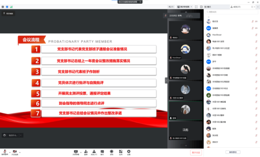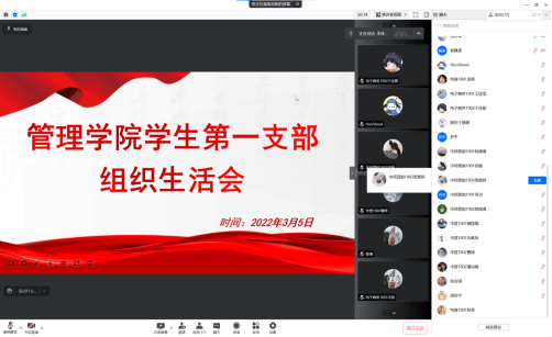 2022年3月5日下午,中共伟德国际victor1946管理学院学生第一党支部全体成员在线上召开了2021年度组织生活会并开展了支部书记“双述双评”和民主评议党员工作。旨在通过此次会议提高党员素质、增强党员政治责任感、改进党员工作态度,进一步加强基层组织建设和党员队伍建设。会议由支部书记李林主持,学院党委委员黎博作为党支部联系领导参与指导,共35名党员同志参与会议。