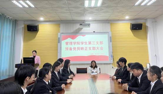 为进一步壮大支部党员队伍,增强党组织凝聚力和战斗力。2023年11月20日,管理学院学生第三支部委员会在F104召开预备党员转正大会,讨论邱云亮等4名预备党员的转正问题。会议由支部书记陈祎婷主持,支部共有6名正式党员,9名预备党员参加会议。