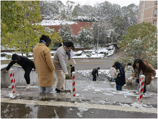 通过科学分工,男生用开水破冰,或用铁锹铲雪,女生则用竹竿打掉路边树上的积雪。虽然天气寒冷,清扫工作十分困难,但是学生党员们依旧冒着严寒,干劲十足,大家心里只想着师生的安全和出行便利,将一条条道路清理得干干净净,所有学生党员积极踊跃,热情高涨,团结一心,干的热火朝天。
