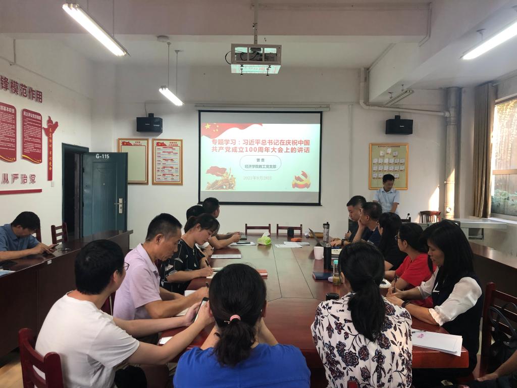 为加强习近平总书记“七一”重要讲话精神学习,2021年9月28日,经济学院教工党支部在G115会议室召开党员大会,以党课的形式专题学习习近平总书记在庆祝建党100周年大会上重要讲话。在党课中,支部书记曾贵简要介绍了建党100周年纪念大会情况,领学了习近平总书记在建党100周年纪念大会上的重要讲话内容。