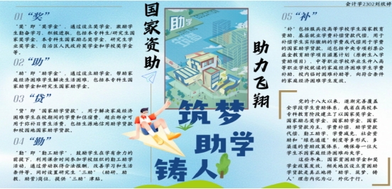 参赛同学的作品不仅契合主题,更在创意设计与视觉呈现上表现出色,或以漫画风格解读奖、助、贷、勤、补、免六种形式,或以人物奔跑的轨迹为主线展现资助政策对于大学生实现个人梦想的重要性。经严格评审,最终大数据管理与应用2402班卜依晗、会计学2302班刘敏和数字经济2202班向玲、会计学2302班刘欣婷、物流管理2401班彭晨宇、国贸2301班曾妍妍的作品被推至学校参加决赛。