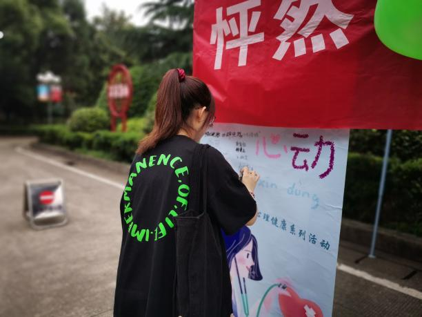 活动在新校区和南校区分别开设宣传站点进行线下宣传,用泡泡机制造泡泡吸引注意,团总支学生联合会心理部干事们在现场进行详细介绍与解说扩大了活动宣传力度,带动大量同学在主题海报签名以及进行有奖问答活动,提高了学生的活动积极性。