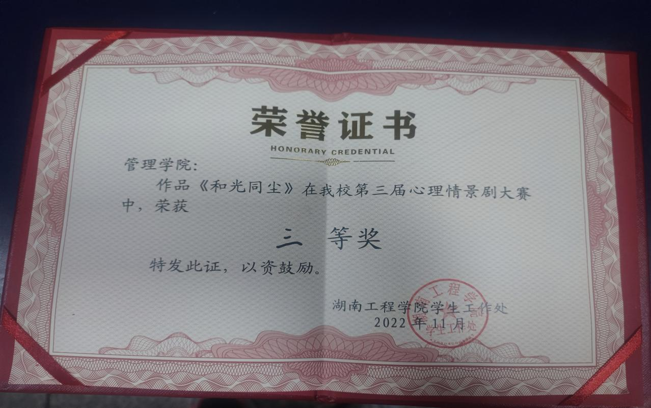 图2:管理学院《和光同尘》心理情景剧大赛奖状
