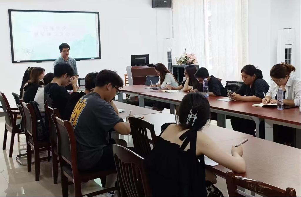 会议伊始,罗蒙老师向与会人员介绍朋辈辅导员的相关工作及其意义。其中着重强调以下几点。首先,在新生开学初期,朋辈辅导员应了解本专业新生的基本情况,并完成新生信息的收集工作。其次,朋辈辅导员应时刻关注新生的生活学习状态,为有需要的新生提供适当帮助,同时加强对新生的安全教育,谨防电信诈骗。最后,朋辈辅导员应组织好军训初期的班级秩序,并时刻了解新生的军训情况,及时帮助新生解决在军训中产生的问题。
