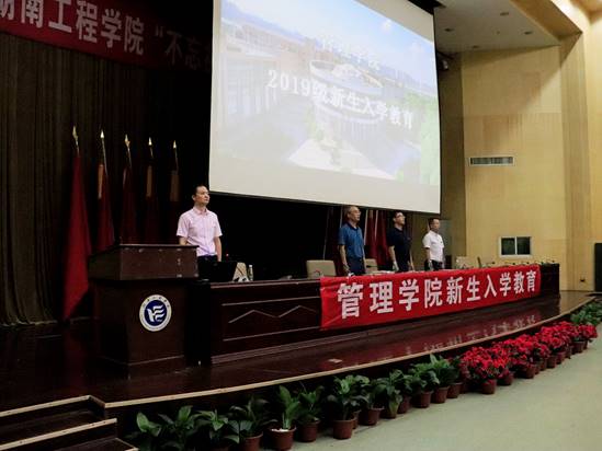 为了让大一新生认识和了解学校,了解大学生活和学习的特点,帮助学生认识自我和树立信心,管理学院于2019年9月17日10:00在图书馆一报告厅举行2019级新生入学教育。本次会议由管理学院副院长潘立军主持,出席人员包括全院领导、各教研室主任、新生班主任、新生辅导员以及2019级新生们。
