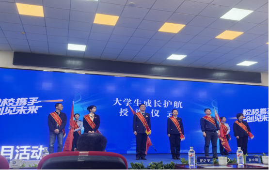 仪式上,张小刚及其他参会领导为服务大学生的“青”心护航队授旗。我校与湘潭市税务局签署了《“税校携手 创见未来”合作备忘录》,双方将深化资源共享、平台共建与人才共育,重点推进税务实践课程开发、校外实习基地建设及创新创业政策支持,持续提升税法普及度与社会遵从度,推动合作向更高层次迈进。