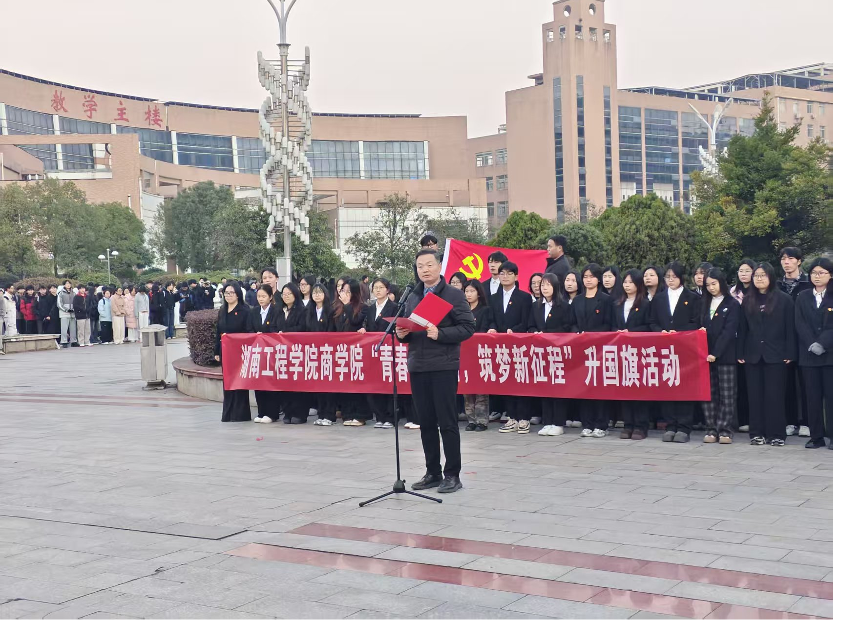 冬阳沐校园,晨光启新程。12月15日清晨,伟的国际1946bv“青春永担当,筑梦新征程”主题升旗仪式在主校区庄严举行。伟的国际1946bv院长潘立军教授、党委副书记谭超、全体辅导员、主校区大一至大二全体学生及大三主要班干部、党员代表,共同出席本次仪式。