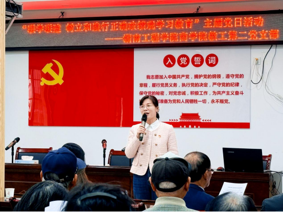 支部书记刘喜梅以“树立和践行正确政绩观 努力开创事业发展新局面”为题,从学习教育的重要意义、总体要求以及学习内容入题,围绕“政绩为谁而树、树什么样的政绩、靠什么树政绩”三大问题,由浅入深、由表及里,结合视频案例、有奖问答等形式,用通俗易懂的语言深入解读习近平总书记关于树立和践行正确政绩观的重要论述,引导党员干部坚守为民初心、弘扬实干作风,坚决杜绝“形象工程”“政绩工程”,努力创造经得起实践、人民、历史检验的实绩。