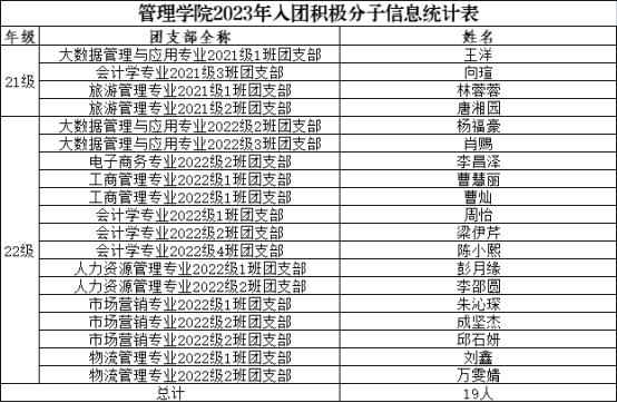 据校团委相关文件及通知精神,参照《中国共产主义青年团发展团员工作细则》,经个人申报,班级团支部推荐,学院团总支评审,拟发展王洋等19名同学为入团积极分子。具体名单公示如下。