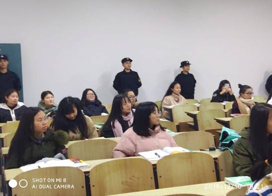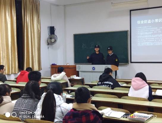 12月10日晚,新校区校卫队第十一组的队员们怀着一颗颗热忱而又激动的心踏进物流管理的教室中,严肃认真地向同学们讲解了校园安全知识,主要关于“防骗,防盗,防火”三方面的内容。
