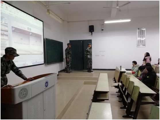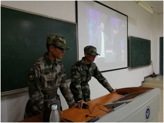 此次宣传前,校卫队成员进行了精心的准备,力求打造一个活跃且积极的宣讲环境,随着校卫队整齐的进入教室,教室里响起了一片掌声,在开讲之前,首先给同学们观看了小品《卖车》,之后,成员陈涛与主讲人蒋运钵给同学们带来了一段擒敌拳表演,博得满堂喝彩。