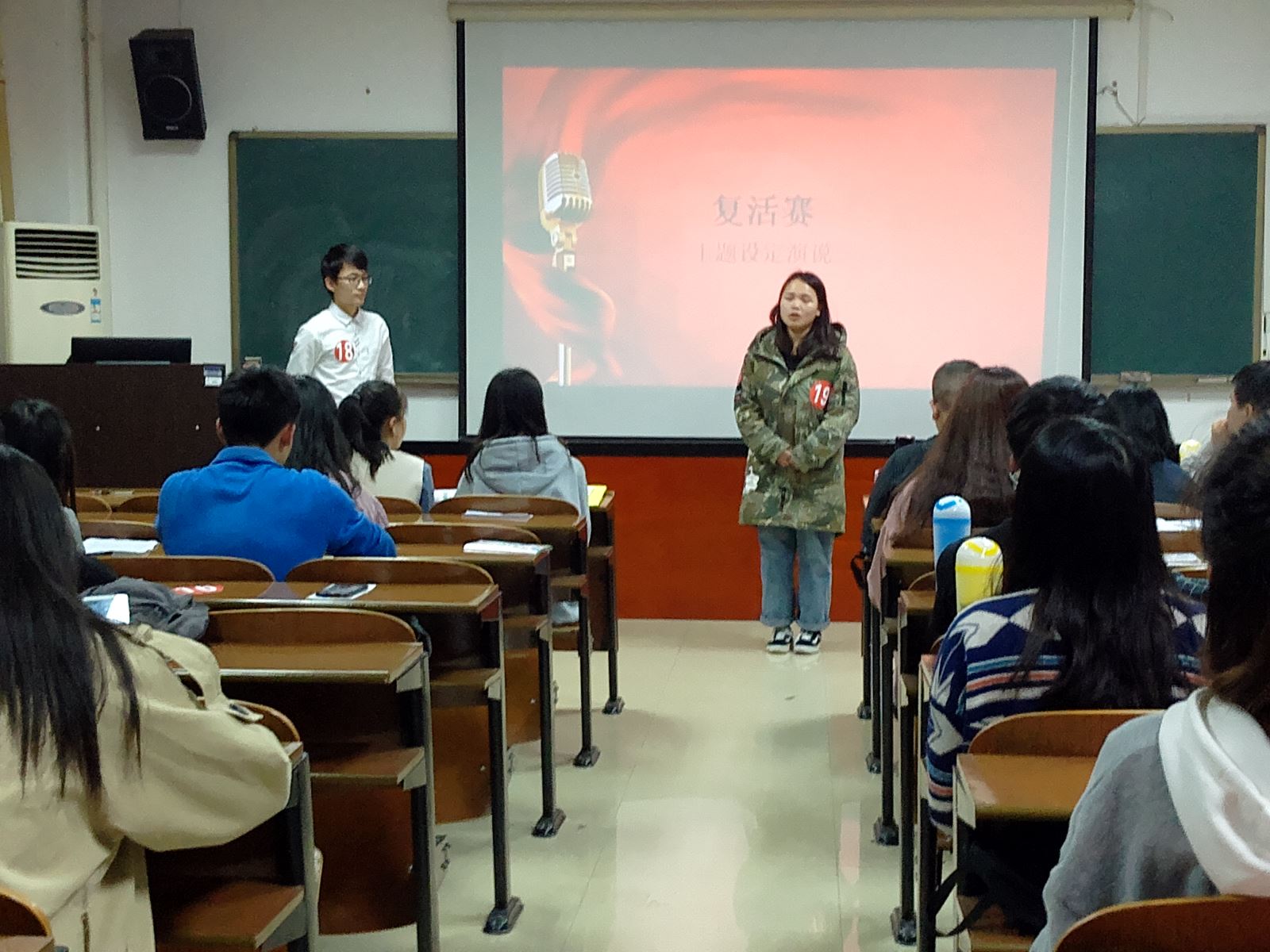 复赛分为两个环节——分组情景演说和复活赛演说。情景演说分成4个组进行,给定情景个人发言。各位选手精神饱满,感情充沛,将现场气氛推向一个又一个高潮。各位优秀的参赛者不仅在台上展现了良好的精神风貌,较高的演讲水平,更体现出他们身上积极向上,努力拼搏的进取精神。整个比赛现场光影闪烁,熠熠生辉。