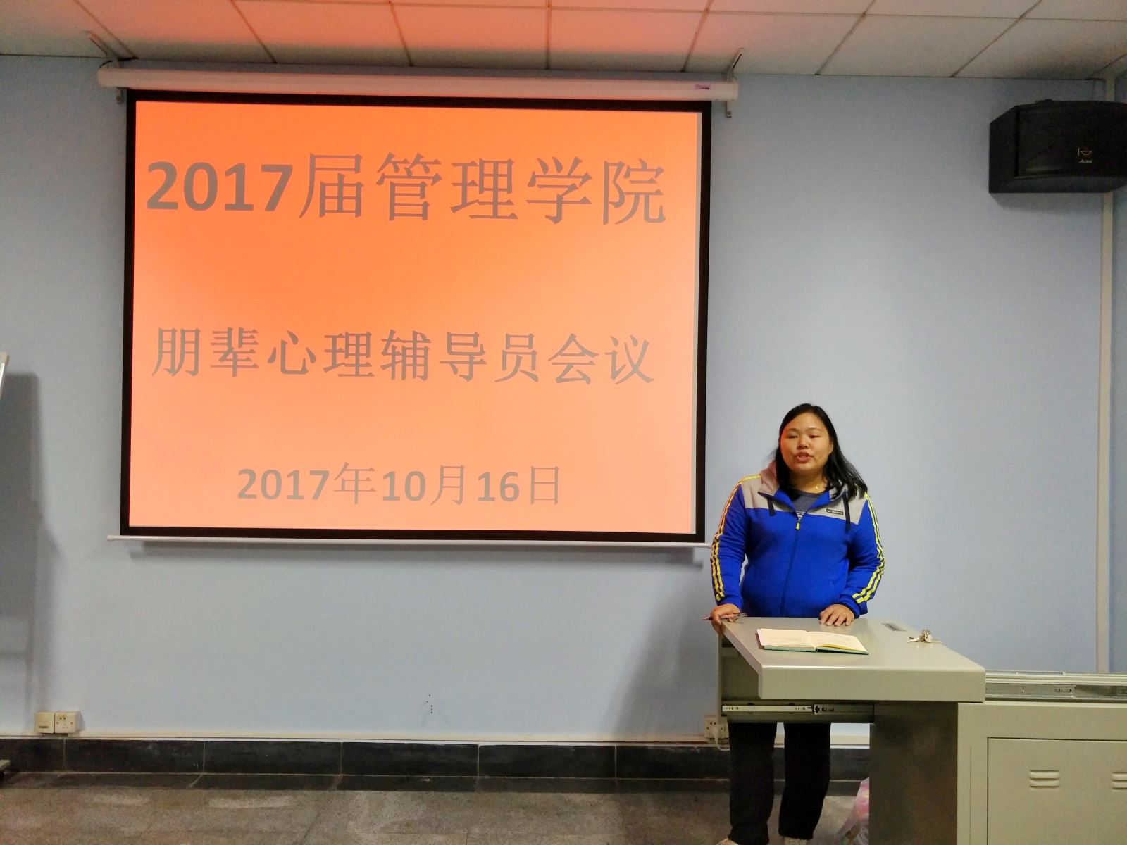10月16日晚,管理学院学办单艳艳老师组织了本学期“2017级朋辈辅导员会议”,并在新校区心理咨询中心团体辅导室召开了朋辈会议,并做了团体辅导活动。在整个过程中,作为朋辈的我们各自表达了自己的意见与看法,希望大家能够齐心协力做好改该做的事,带领出一个优秀的班集体,这是我们的职责,也是为了学院更好的明天。