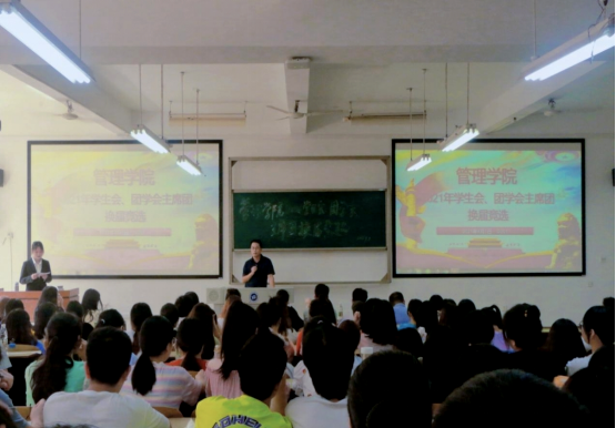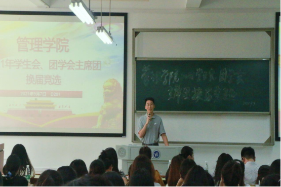 行而不辍,未来可期。为进一步加强和完善学生干部队伍建设,更好地适应新形势对学生组织工作的要求,充分发挥学生组织的桥梁、纽带作用,凝聚青年力量,2021年9月7日,管理学院在主校区D201成功举行2021-2022届团总支、学生会主席团候选人换届竞选大会。管理学院党委书记余博、党委副书记谭超、学办主任黎博、学办全体辅导员老师出席本次大会,现任主席团、部长团代表及全体学生党员(含预备党员)参与大会。