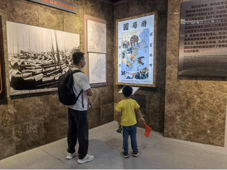 游客为孩子讲解《时局图》
