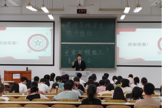 会议第一项,管理学院团总支书记彭小玲致辞,她肯定了2022-2023届学院团学干部的工作,感谢各位团学干部对学院发展所做贡献,同时对新一届学生干部提出了坚持理论学习,信仰在心;坚持敢想敢为,担当在肩;坚持服务师生,用情在心三点希望,希望新一届主席团不忘初心,不断坚定理想信念,做好服务同学、服务学院大局的工作,使管理学院学生联合组织驰而不息、赓续荣光!