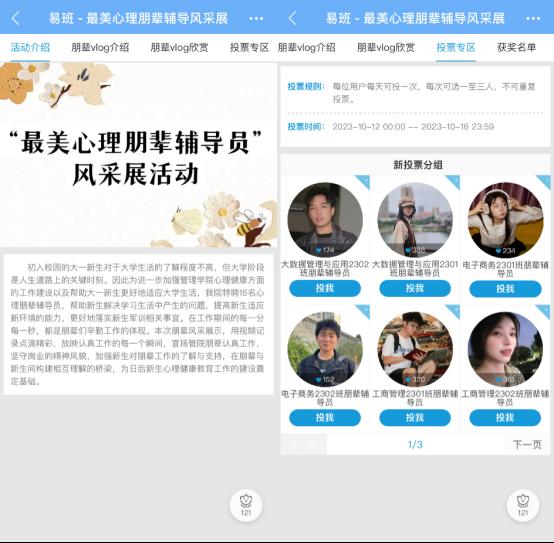 活动共历时五天,总共分为三个部分。首先,各朋辈拍摄军训日常并自制剪辑vlog,附带自我介绍以及军训辅导感悟上交至心理部。其次,易班管理中心进行视频审查工作,并以易班app为平台进行朋辈vlog展示。最后,我院立足于公平公正的原则,于10月12日至10月16日组织学生进行投票。此次活动我院同学积极参与,最后根据得票结果评选出特等奖两名,一等奖三名,二等奖三名,三等奖四名,优胜奖四名,获奖名单附下。