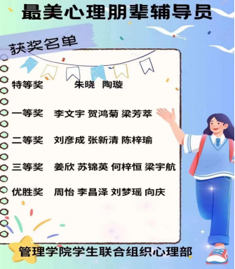 金秋九月,大学生活如期而至,新生向往大学生活的同时又感到困惑迷茫。为缓解新生的入学压力,引导新生快速适应大学生活,伟德国际victor1946管理学院遴选了16位心理朋辈辅导员。在军训期间,各朋辈认真负责,着力于为新生解疑答惑。与此同时,我院以鼓励朋辈为出发点,于2023年10月中旬举行了“最美心理朋辈辅导员”风采展活动。本次活动由管理学院学生联合组织心理部和易班管理中心承办,面向管理学院全体学生。