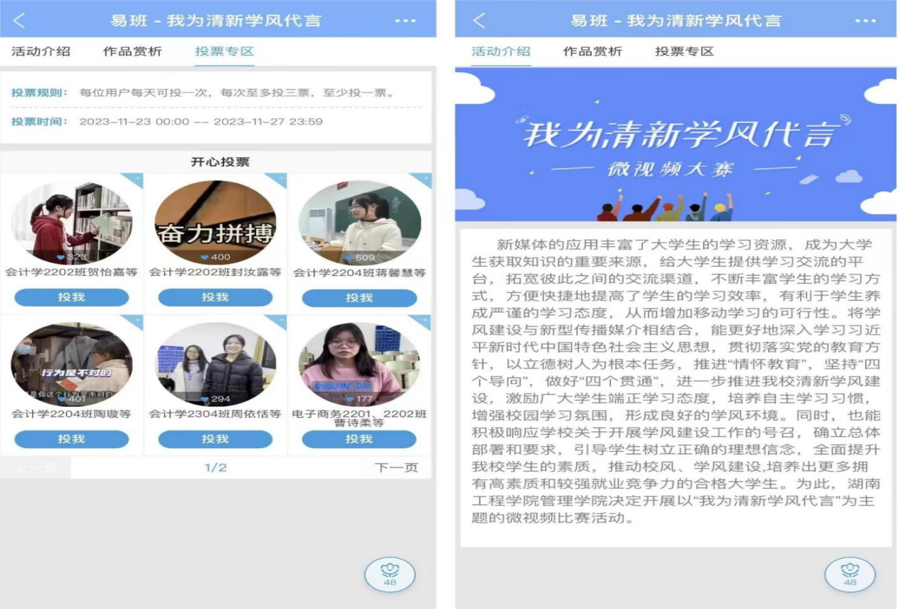 活动伊始,各专业以班级为单位组成相应的小组进行活动报名。参赛者结合实际生活,紧扣“清新学风”这一主题,采用多样化的拍摄方式进行微视频创作,重现校园生活中的场景,以确保更好向观众展示“清新学风”概念。视频拍摄完成后,易班管理中心将参赛作品进行收集并完成作品的初步筛选,最后将优秀作品汇总,于11月22日上传至易班App活动平台进行投票展示,并由各班长组织班级成员为心仪的参赛作品投票。活动尾声,易班管理中心根据投票结果选出一等奖一名,二等奖两名,三等奖三名,优胜奖六名,获奖名单附下。