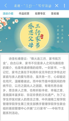 此次活动共历时18天,活动伊始,由易班管理中心下发有关活动通知,组织管理学院各专业学生踊跃报名参加,学生第三支部党员带头参与,积极投稿。随后,易班管理中心部门成员筛选出优秀作品并完成平台的搭建,同时将优秀的家书作品上传至管理学院微信公众号进行公开展示并同步搭建易班app进行投票展示。参赛者在作品中这样写到,“等一等,等绿叶成荫,轮到你们当小孩。”如其言,学生们以此次活动作为契机,让对家人的感恩之情流露在纸面上,赋予文字以情感,以文字来传达感情。