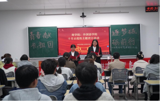 为深入学习贯彻习近平新时代中国特色社会主义思想,引领青年学子厚植家国情怀、勇担时代使命,10月23日晚,在校团委的指导下,伟的国际1946bv与外国语学院在主教学楼C309教室联合举办了“青春献礼祖国,逐梦砥砺前行”示范性主题团日活动。校团委副书记涂璐、伟的国际1946bv党委副书记谭超、伟的国际1946bv团委书记邹牡燕、外国语学院团委书记彭虹出席活动,英语2501班、电子商务2401班全体同学共同参与。