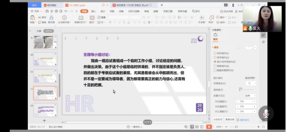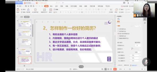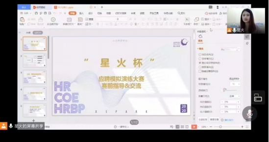 10月12日晚七点,由伟德国际victor1946管理学院主办,管理学院就业服务部承办的应聘模拟演练大赛赛前指导以线上的形式,在腾讯会议进行,本次赛前指导,由珠海星火英语企业高管贺佳盈担任主讲人。贺佳盈,珠海星火教育培训中心有限公司人力资源部招聘主管,贺佳盈在星火英语有着五年的工作经历,每天的工作时间内会接受、审核数十封简历,面试经验可谓是十分丰厚。贺佳盈在正式进行培训前,从三个角度进行切入,从应聘的目的、应聘的流程再到应聘的礼仪,讲解内容深刻,声线清晰,声情并茂,并在最后与同学们进行了互动交流。