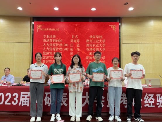 大会开始,首先由副校长陈赤平教授为大会致辞。陈校长结合了自身多年培养研究生的经验,对台下的大三学子进行了敦敦教诲,而后,对于即将毕业,开启新征程的上岸大四同学,陈校长也提出了三点期望,第一,要树立长远的目标,有目标,才有动力。第二,要为设立的目标付出自己的努力,注重量的积累。第三,要乘势而上,只争朝夕,在行胜于言的实干中成就人生高度。随后,管理学院党委书记余博宣读了2023年考研优秀毕业生名单,并为到场的51位上岸同学进行了颁奖。大会的最后,由管理学院院长徐运保教授进行了总结发言,希望2024年即将考研的同学们理清考研动机,明晰前进方向,坚定信念做好规划,明年此时,恭候佳音。