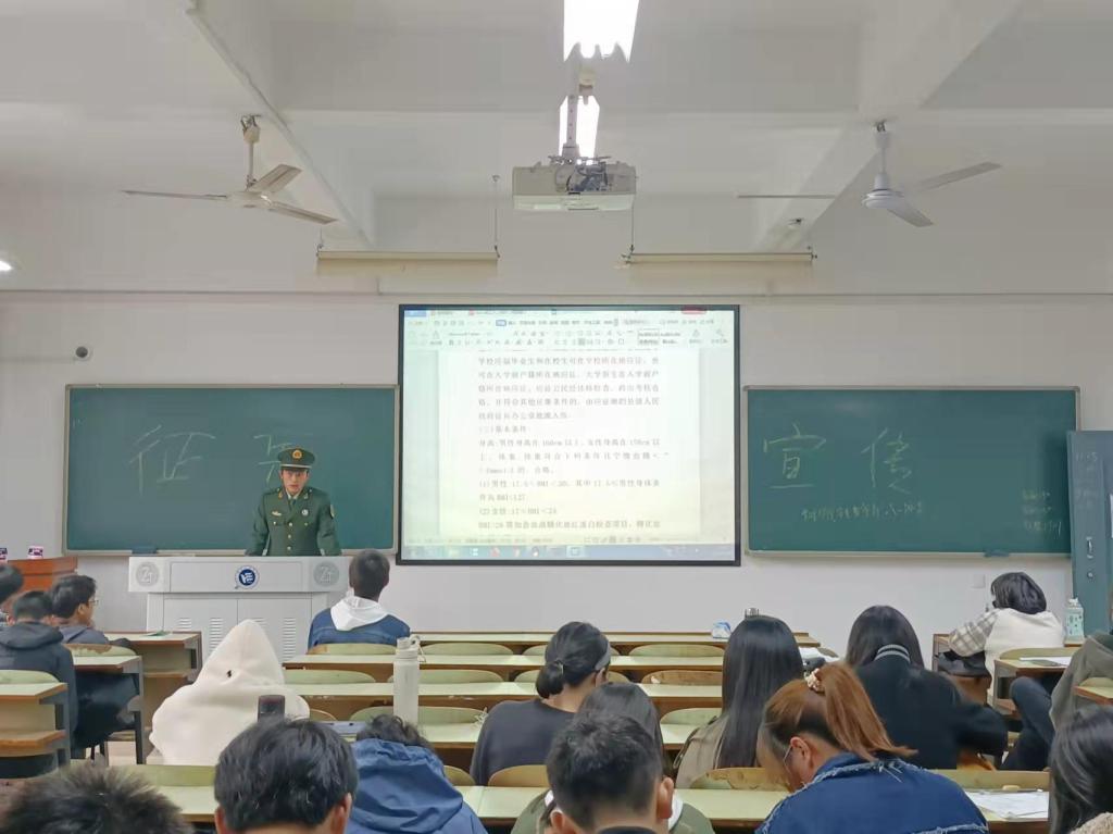 为鼓励学生积极参与应征入伍,提高官兵征集质量,推进国防和军队现代化建设,伟德国际victor1946管理学院开展大学生入伍征集宣传工作,并于11月12日在各班召开“征兵入伍宣传”主题活动。本次活动由管理学院安全督察部负责,特邀八一协会主讲,18-21级全体学生到场参与。